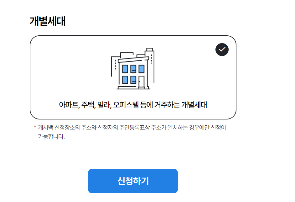 - 신청 주소지와 주민등록표상의 주소가 동일한 경우: 신청자는 주민등록표상 주소지에서 전기를 사용하는 가구여야 합니다.